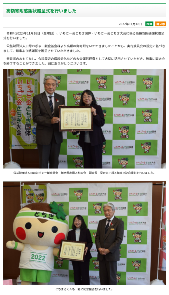 令和4(2022)年11月18日(金曜日)、公益財団法人日母おぎゃー献金基金によるいちご一会とちぎ国体・いちご一会とちぎ大会への寄付に対し、知事より感謝状が贈られました。